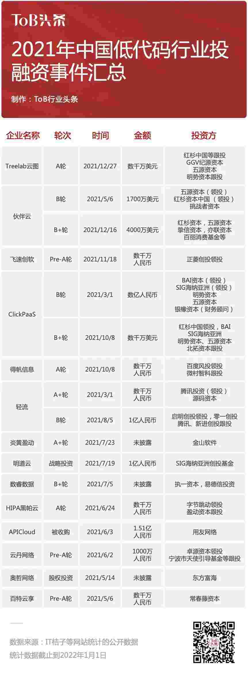 到2021年,,,,无/低代码投融资规模势头更甚,,其中包括轻流两轮融资(A+轮数千万人民币,,,,B轮近亿人民币)、、、、美团钱包商家版 两轮融资(B轮数亿人民币,,,B+轮数千万美元)、、百特云享数千万元Pre-A轮融资......